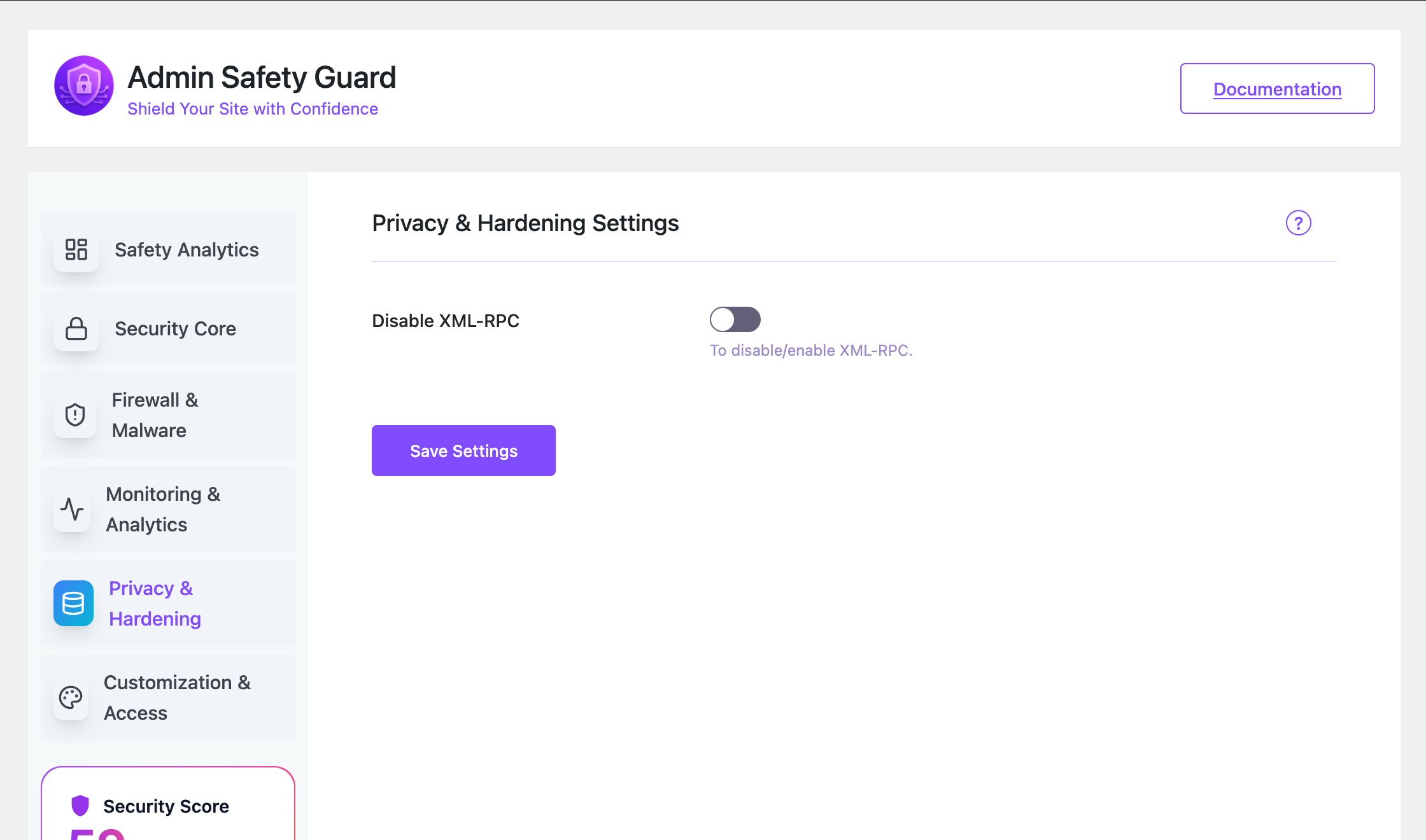 - Set-and-Forget Convenience: You don’t need a degree in cybersecurity to protect your website. Admin Safety Guard ships with a clean UI and intelligent smart defaults, allowing you to instantly deploy complex guardrails—like disabling XML-RPC or locking down database files—with just a few simple clicks.