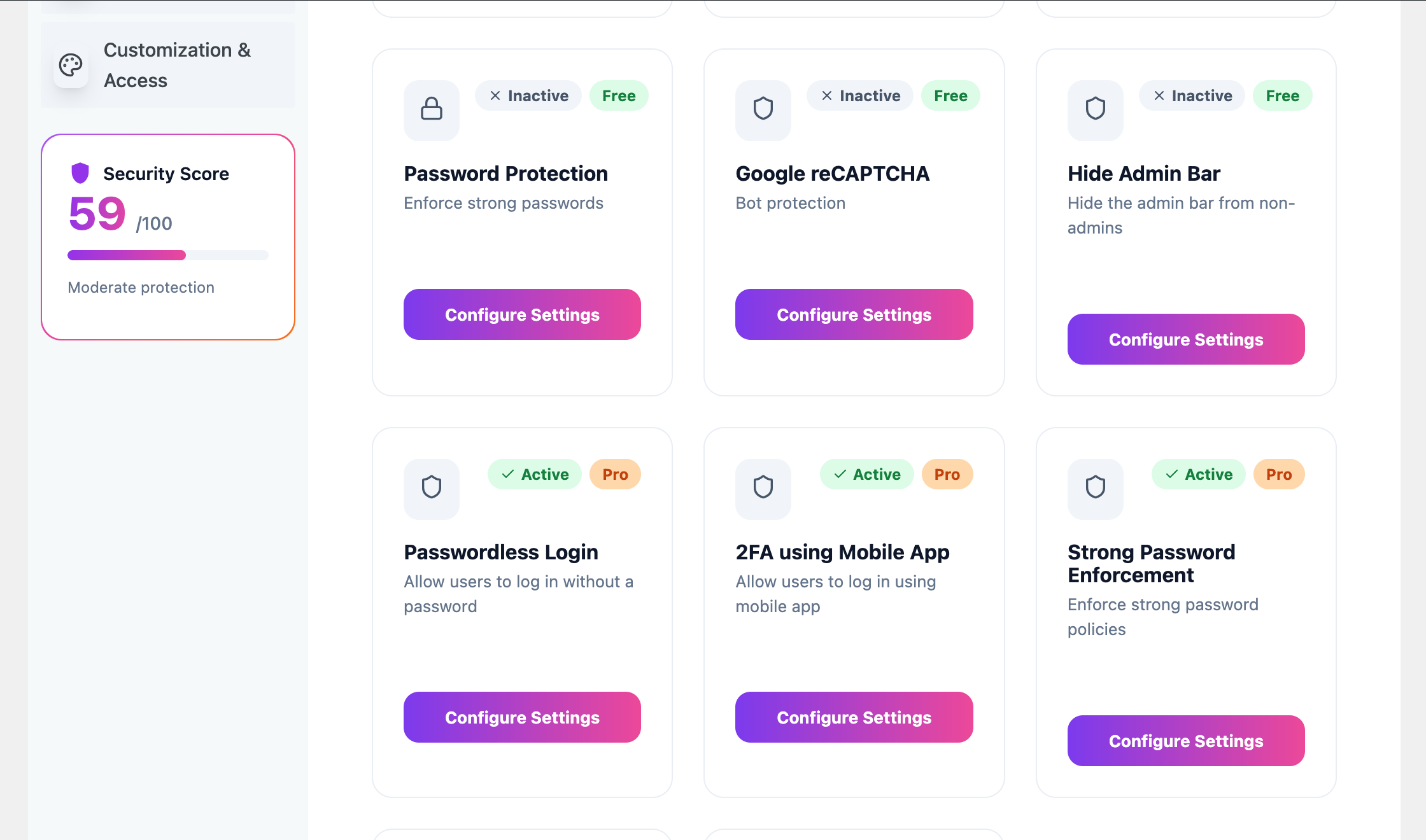 It moves beyond basic login protection by introducing proactive defense mechanisms, including Smart 404 Blocking to catch hackers during reconnaissance, comprehensive File and Database Security to protect core assets, and automated Malware Scanning to detect hidden threats. Additionally, Pro grants you granular, role-based control over user sessions, advanced CAPTCHA integrations for ultimate spam prevention, and a suite of flexible design tools to deliver a fully branded, highly secure, and seamless login experience for your clients and team members.