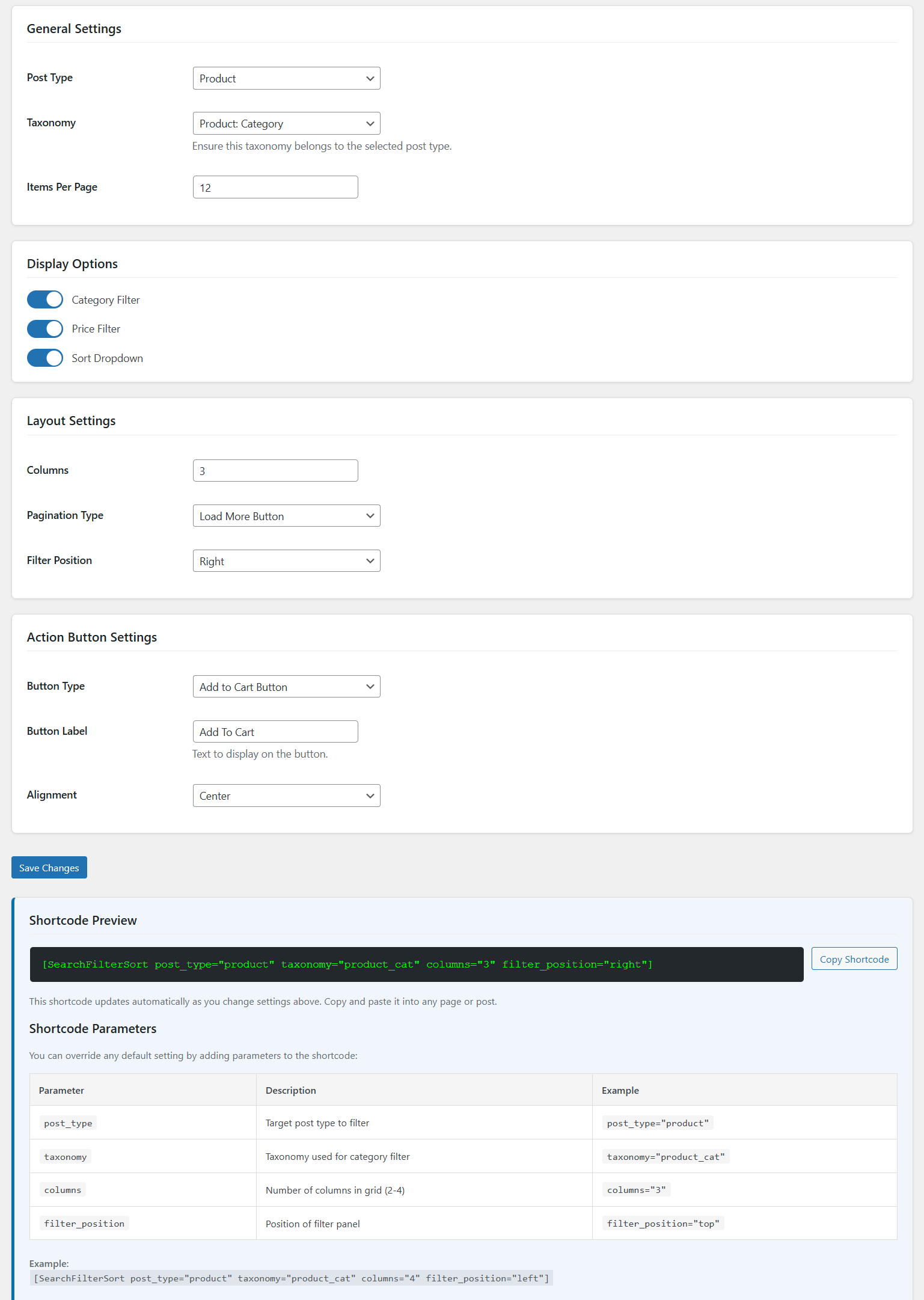 - Added admin settings for filters, layout, and action button.