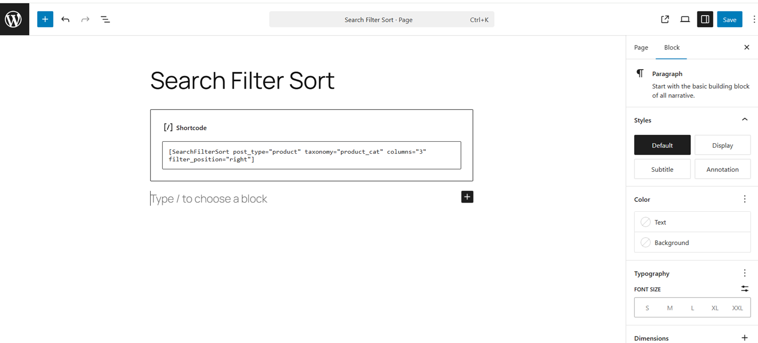 [SearchFilterSort]shortcode into any page or post.
